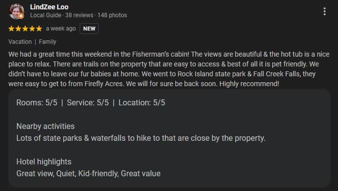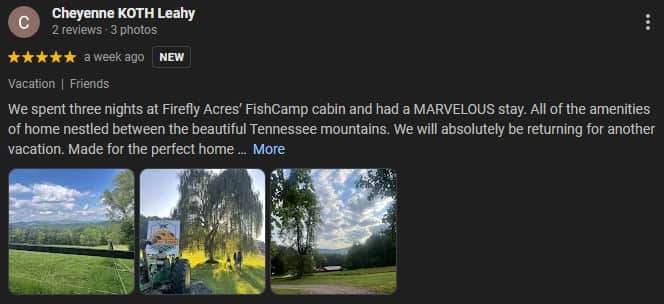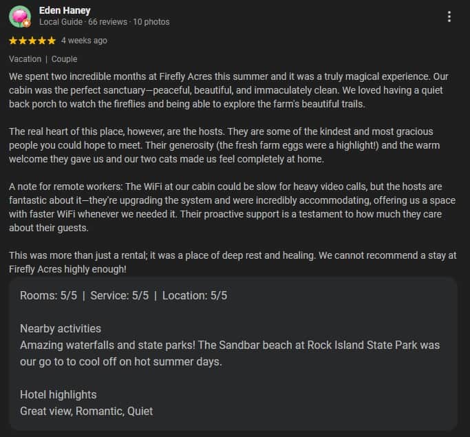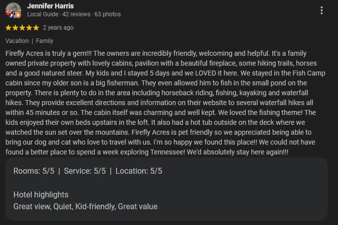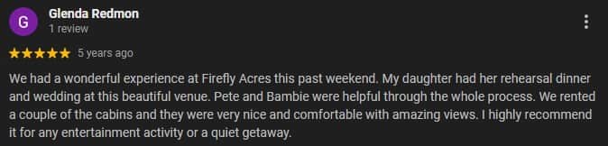 To all of the wonderful guests that we have had the pleasure of serving over the years - thank you for sharing you kind words and experiences. Every review means the world to us and helps our small, family owned and operated business to grow and welcome more couples, families, and friends to FireFly Acres. Support like yours makes all the difference, and we are so thankful to be a part of your special memories in the Upper Cumberland.